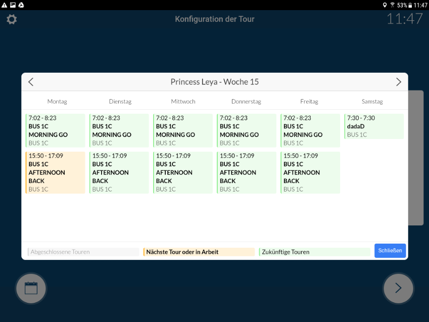 Jeder Fahrer hat einen individuellen Zugang zu ProvaBUS Mobile, d.h. er greift nur auf seine Tourdaten zu. Mit unserem neuen ProvaBUS Mobile 1.11 sieht der Fahrer seine kompletten Tages- und Wochentouren jederzeit und überall. Sein Fahrplan wird in Echtzeit direkt vom Schreibtisch des Verkehrsleiters aus aktualisiert. Er kann jederzeit eine beliebige Tour hinzufügen/entfernen oder ändern, um die Zeit und die Kosten für seinen Bus/Fahrer zu optimieren.